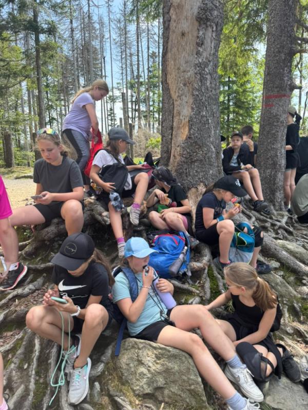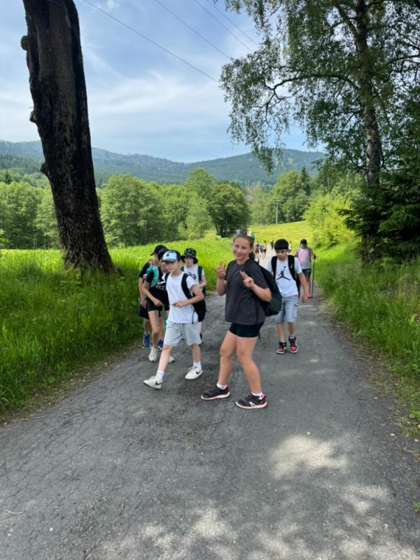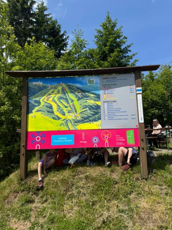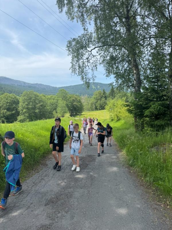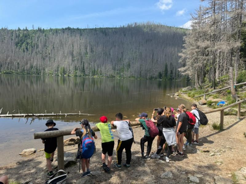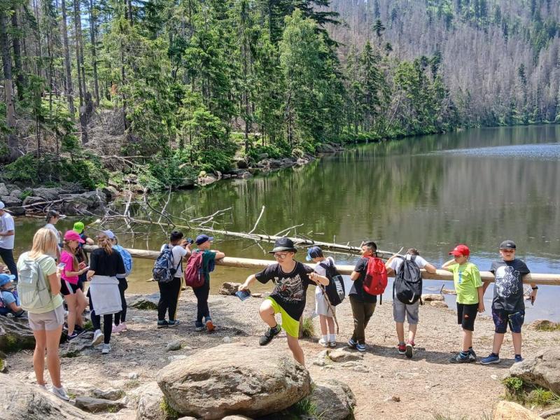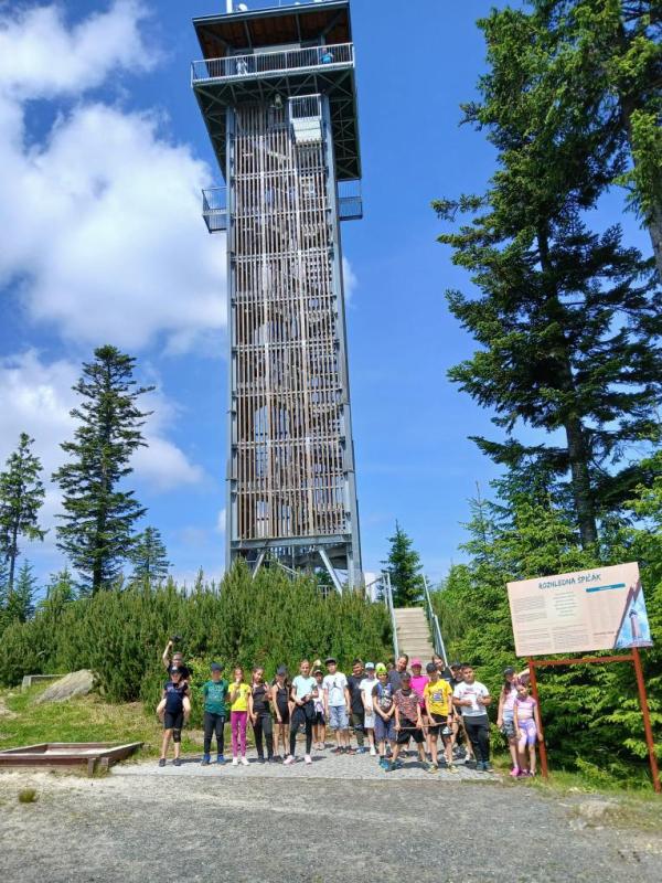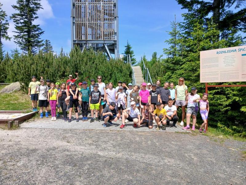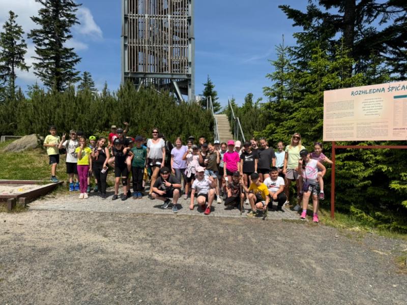 Ve středu 18. června 2025 se žáci čtvrté a páté třídy vydali na výlet plný dobrodružství a poznávání krás Šumavy. Brzy ráno jsme nastoupili do vlaku a s nadšením jsme se těšili na vše, co nás čeká. Po příjezdu do Železné Rudy, konkrétně na Špičák, nás čekal výstup po strmé sjezdovce k rozhledně. Cesta vzhůru nebyla snadná, ale výhled, který se nám po zdolání kopce naskytl, stál rozhodně za všechnu námahu.