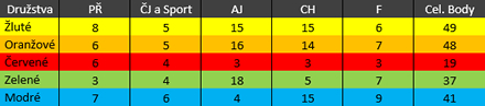 Z výše uvedené tabulky se můžete dočíst, že modré družstvo se umístilo na 3. místě, oranžové na 2. místě a žluté na 1. místě s předstihem jednoho bodu. Jejich boj byl celkem vyrovnaný. Žluté, oranžové a modré družstvo získalo přívěsek na klíče s krtečkem. První a druhé místo bylo navíc odměněno sladkostmi. Každý žák, který se zúčastnil soutěže, dostal lepidlo.