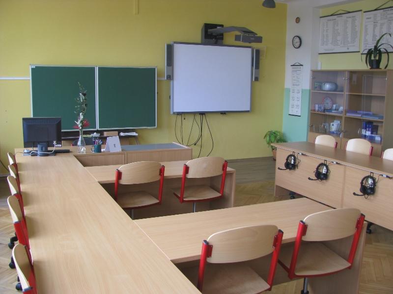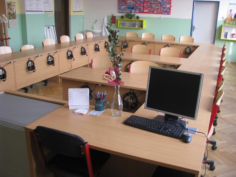 Učebna cizích jazyků je vybavena také moderním nábytkem: lavice se sluchátky, pohodlné židličky na kolečkách, ovládací pult s funkcí audiodabing. Je zde umístěna také interaktivní tabule SMART.